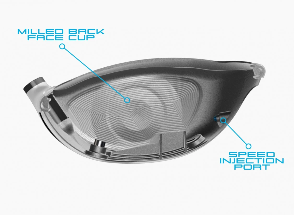 The milled back face cup is crafted from high strength titanium to encourage fast ball speeds. Internal milling varies face thickness and pinpoints performance where golfers need it the most, making way for an intelligently optimized sweet spot that covers the most common impact areas. A new toe side Speed Injection Port lets us more efficiently calibrate each individual head to the threshold of the maximum legal limit of ball speed while Twist Face® continues to help all golfers find more fairways.